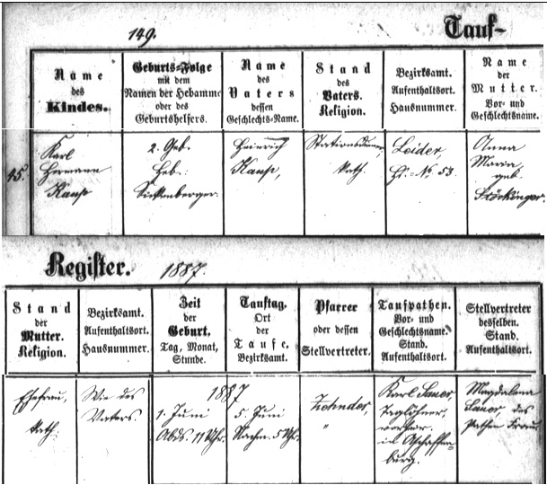 Abb. 2: Karl Kaup – 1. Juni 1887 – Taufregistereintrag Blatt 149, Eintragnr. 45, Pfarrkirche Unsere Liebe Frau, Aschaffenburg