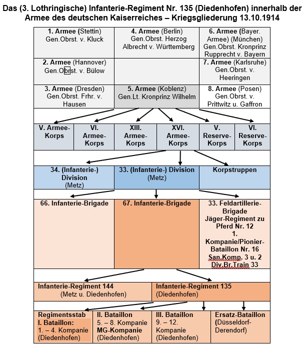 Abb. 5: Das Infanterie-Regiment 135 innerhalb der Armee des deutschen Kaiserreiches – nach: Cron, H.: Geschichte des Deutschen Heeres im Weltkriege 1914–1918. Berlin 1937; Histories of two hundred and fifty-one divisions of the German Army which participated in the war 1914–1918. S.402; Schlachten des Weltkrieges. Bd. 18. Argonnen. A. a. O., Anhang