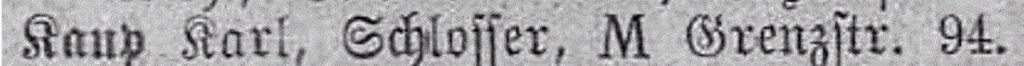 Abb. 4: – Adressbucheintrag für Karl Kaup im Duisburger Adressbuch von 1912 – Quelle: Duisburger Adressbuch, 1912. S. 404 [433] – Link: https://dfg-viewer.de/show?tx_dlf%5Bdouble%5D=0&tx_dlf%5Bid%5D=http%3A%2F%2Fwww.duisburg.de%2Fdigitalisate%2Fstadtarchiv%2FAdressbuecher%2FAdressbuecher_DU_1912%2Fmets.xml&tx_dlf%5Bpage%5D=433&cHash=affa3c1784b808be66e084dfedc5a6d0