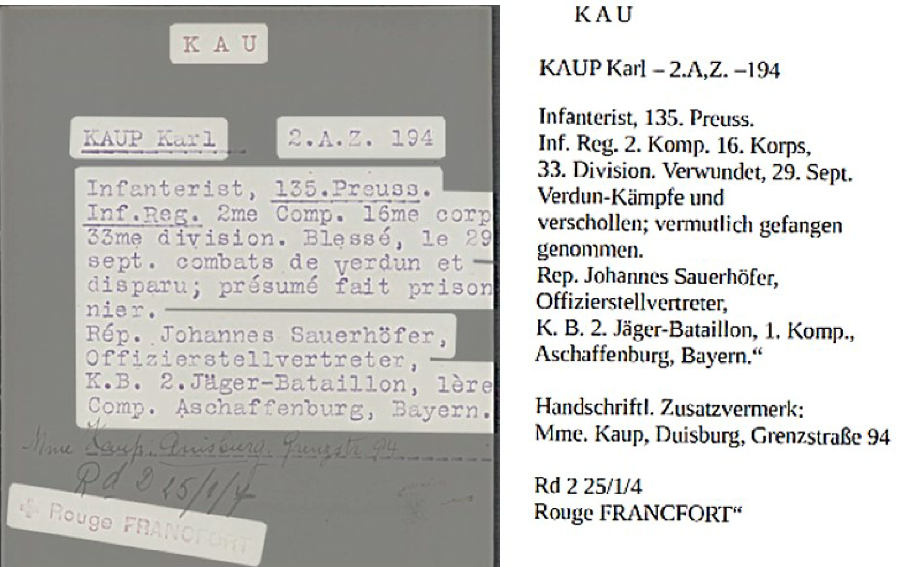 Abb. 7: Vermisstenkartei des Internationalen Roten Kreuzes für Kaup Karl – Quelle: https://grandeguerre.icrc.org/en/File/Details/3467714/1/2/