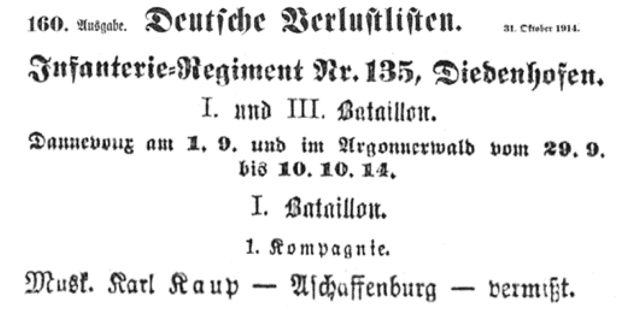 Abb. 8. Kaup Karl – Meldung in der Deutschen Verlustliste,160. Ausgabe vom 31.10.1914. Seite 2085