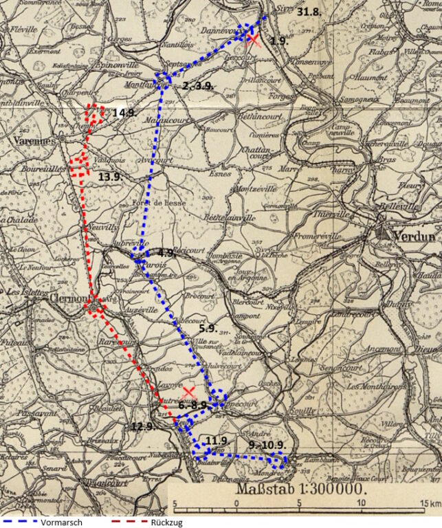 2.–5.9.1914   Feindverfolgung über Septsarges – Monfaucon – Avocourt – Parois – Julvécourt