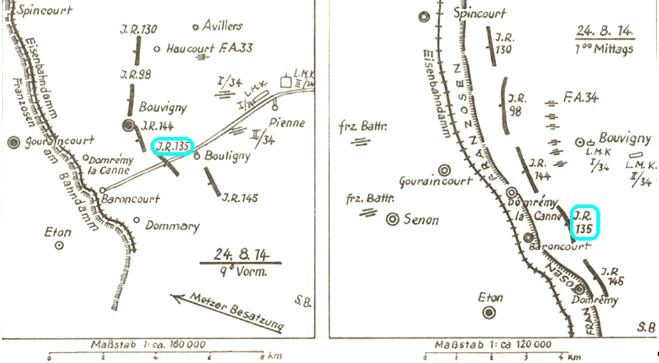 Karte 2: 24.8.1914 – Das Inf.Reg. 135 in der Schlacht bei Baroncourt – Quelle: Erinnerungsbl. dt. Regimenter. Bd. 343. A. a. O., Karten 3 und 4, (bearb. d. Verf.)
