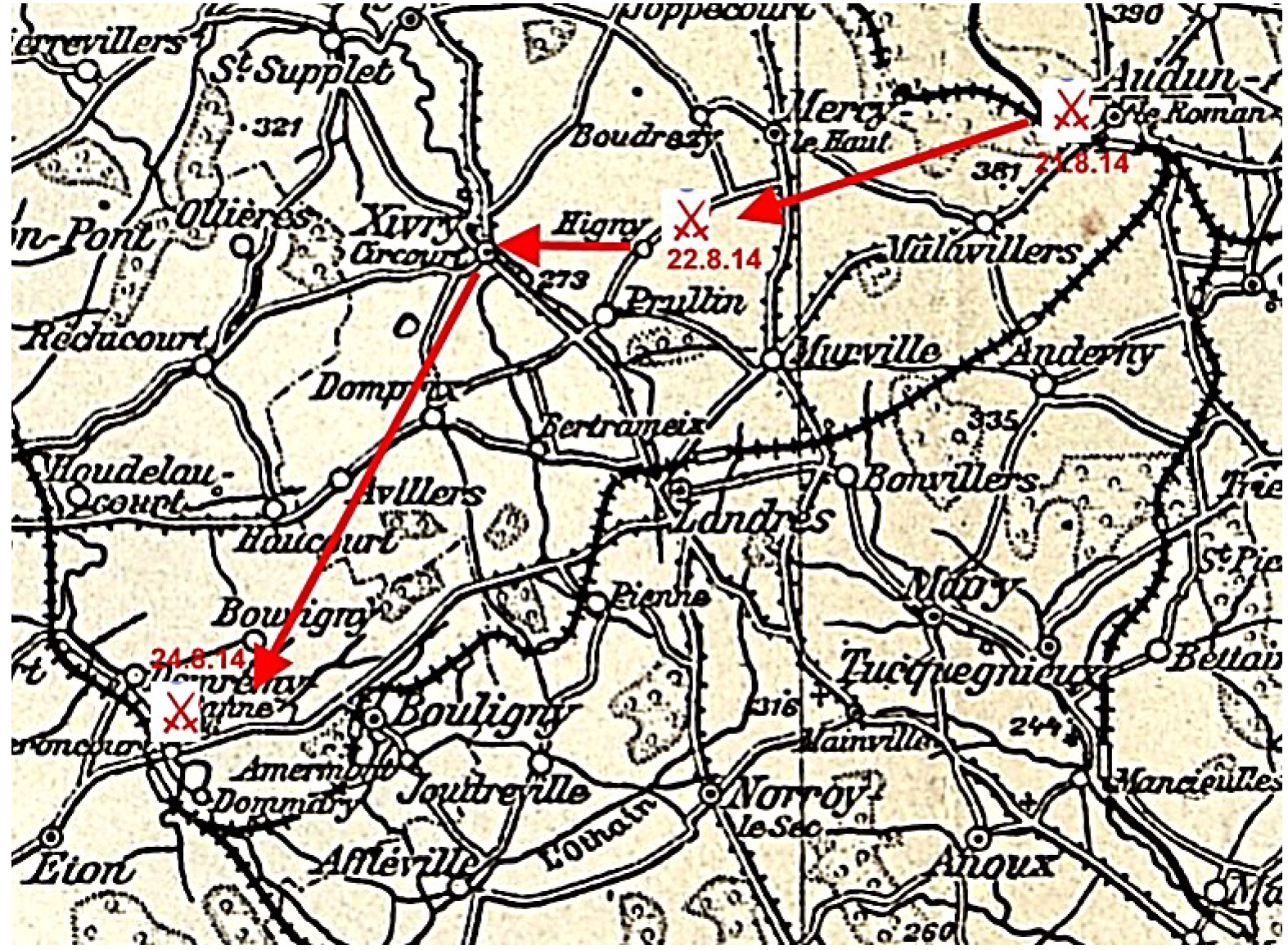 21.8.1914   Erste Feindberührungen westlich Nonkeil und bei Audun le Roman