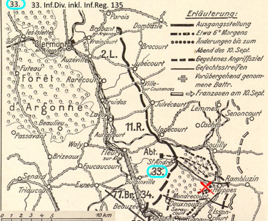 Karte 7: Die 33. Inf.Div. in der Schlacht um Varennes – Quelle: Der Weltkrieg 1914–1918. Bd. 5. A. a. O., Karte 3; (Ausschnitt; bearb. d. Verf.)