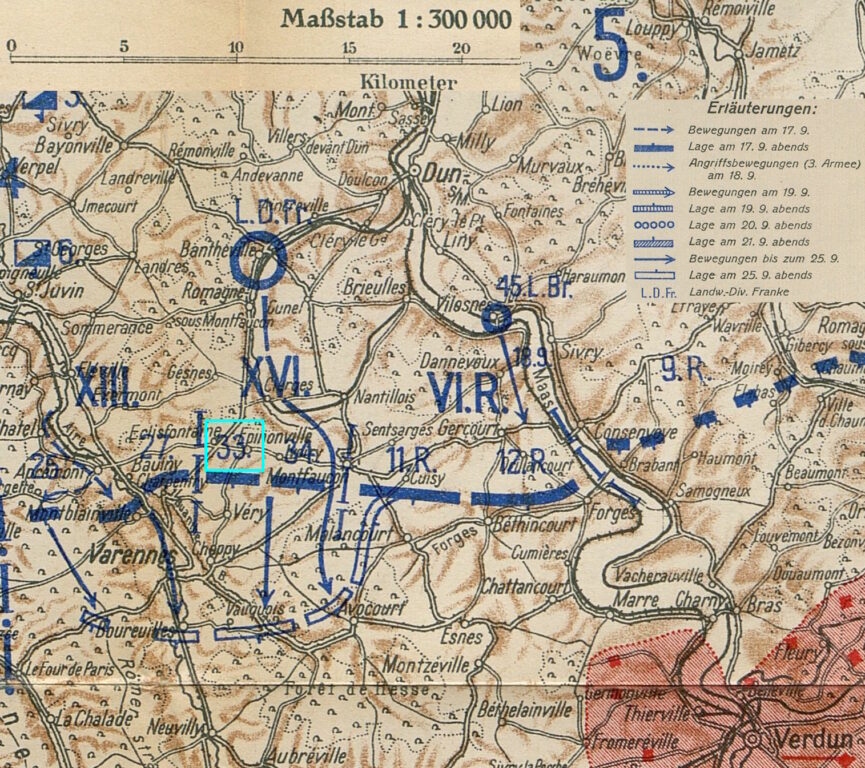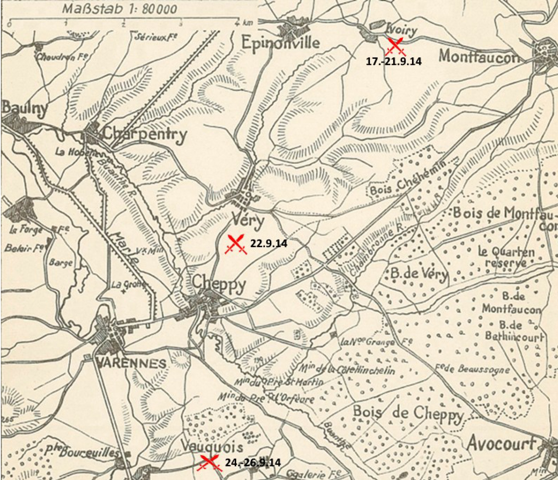 22.9.1914   Vormarsch des XVI. Armee-Korps Richtung Süden auf die Linie Very[19]–Höhe 242 – Feindliches Artilleriefeuer sorgte schon am ersten Schlachttag für 155 Mann Verluste alleine beim Inf.Reg. 135.