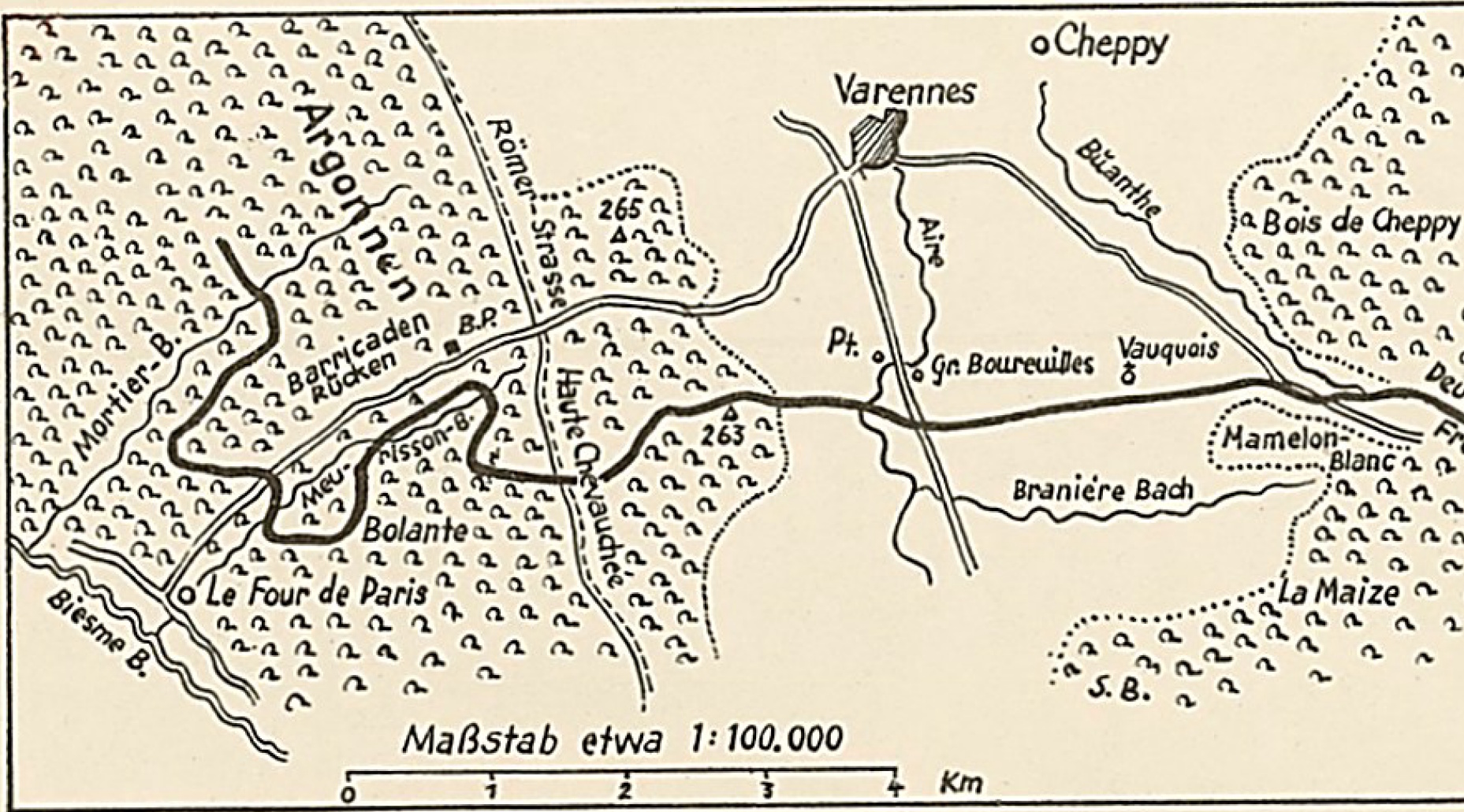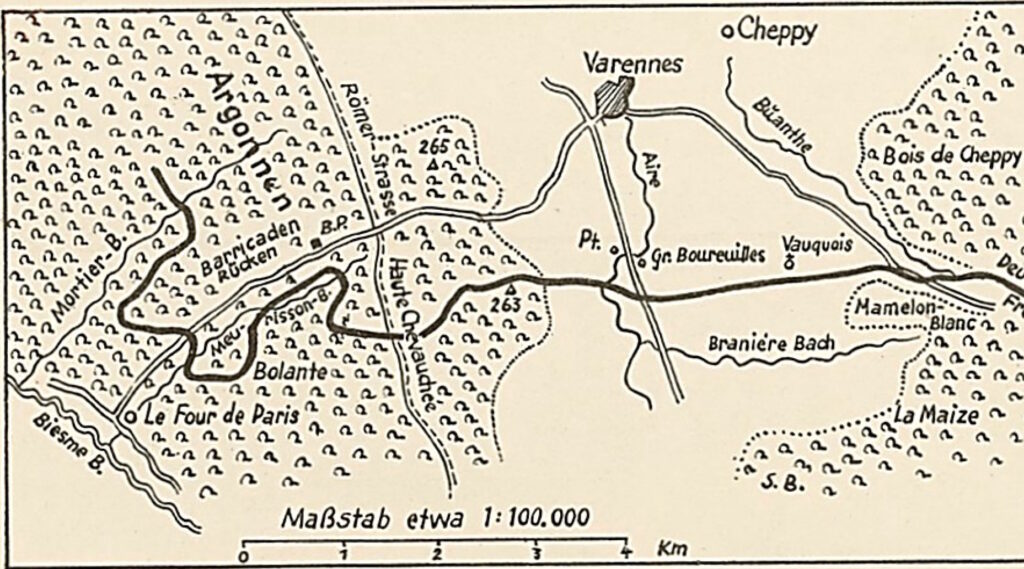 „Die Argonnenkämpfe des Weltkrieges haben sich fast nur in dem mittleren Teile des Waldgebirges abgespielt, auf dessen Höhenkamm die vorerwähnte uralte Römerstraße läuft, die damals z. T. verfallen, z. T. noch benutzbar war. Etwa 3 km südwestlich von Varennes kreuzt sie die Straße Varennes—le Four de Paris, in der Gegend des Abri du Crochet, dem späteren „Hanauer Platz“, schneidet sie den Weg Montblainville–Servon und bei la Viergette, einem alten, in einen Baum eingelassenem Heiligenbild, die Straße Apremont–Binarville. Diese drei größeren Wege sind die einzig brauchbaren, ostwestlich verlaufenden Querverbindungen durch die mittleren Argonnen. […] Die Geländegestaltung der Argonnen ist außerordentlich abwechselungsreich. Charakteristisch sind die schon erwähnten, vielen kleinen Wasserläufe, die, z. T. tief eingeschnitten, das Kampfgelände zerklüften. Es entstehen auf diese Weise in regelloser Vielgestaltigkeit die mannigfaltigsten Bergformationen, bald breite Bergrücken, bald schmale Zungen, hier runde Kuppen, dort schroffe Grate. Häufig bilden sich natürliche Festungen, wie z. B. der bastionsartig vorspringende Felssturz am westlichen Charmes-Bach-Hange, die „Eselsnase“, oder der trutzige Bergkegel des „Storchennestes“.